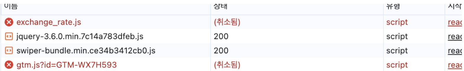 저코드를 적용하고 오류가 있었는데. 요청한 스크립트가 취소되는 현상이였다.