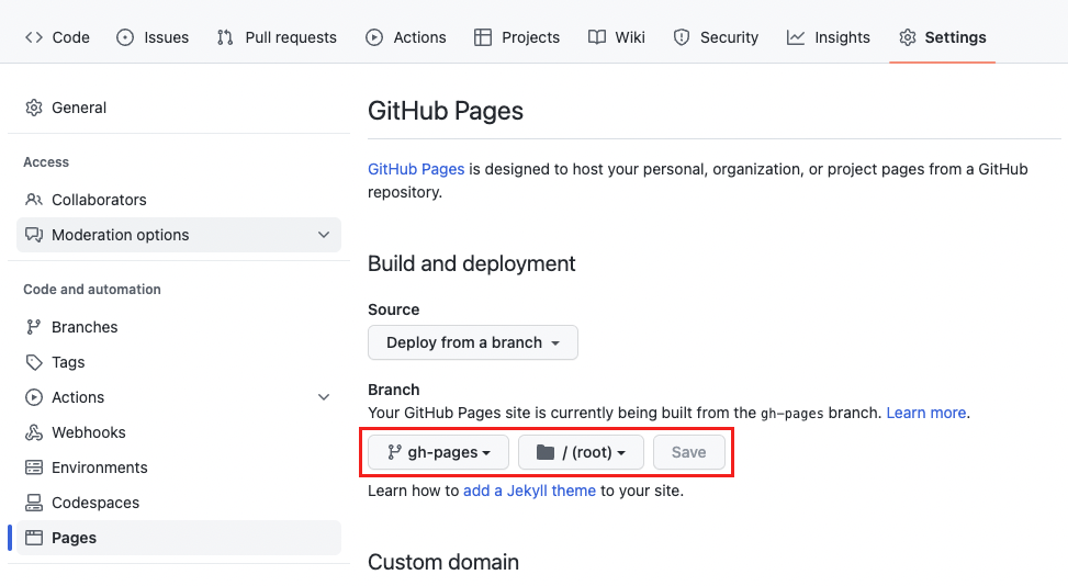 배포한 저장소 settings -> pages 에 들어가서 branch를 gh-pages로 변경해 주면 된다.