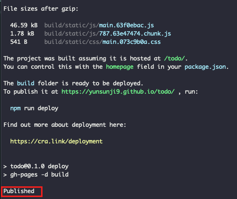 작업을 완료하고 npm run deploy로 배포를 하게되면 Published라고 뜨는 것을 볼 수있다.
